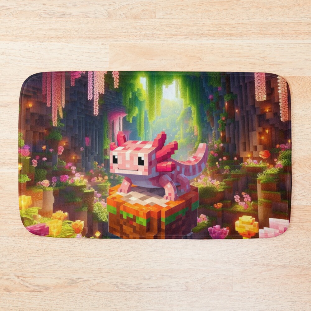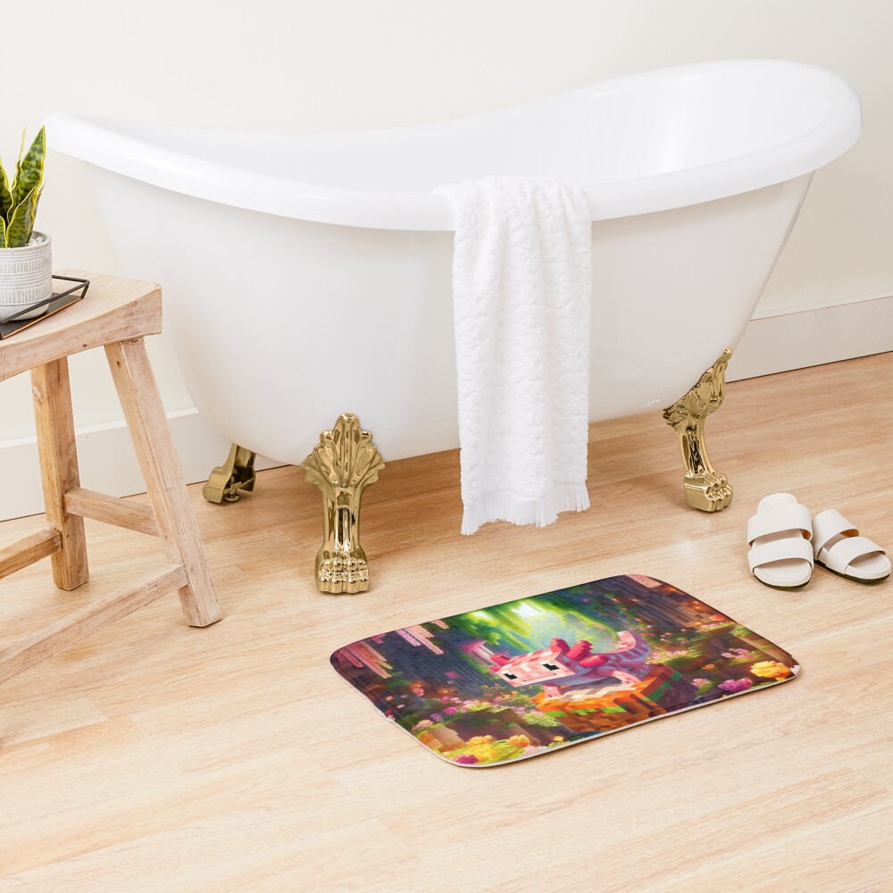 Cute Pink Minecraft Axolotl On Block Bath Mat